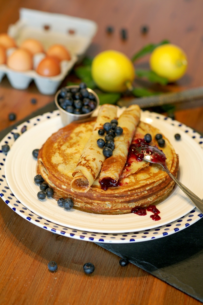 In Denmark we usually ad sugar and/or jam to the Pancake. We then roll it, and eat it with our fingers. Well, at least, that is how we did it, when I was a child. This Sunday for Afternoon Pancakes, I will let my guests choose, weather they will use a knife and fork, or eat with the childish joy of just using their fingers.